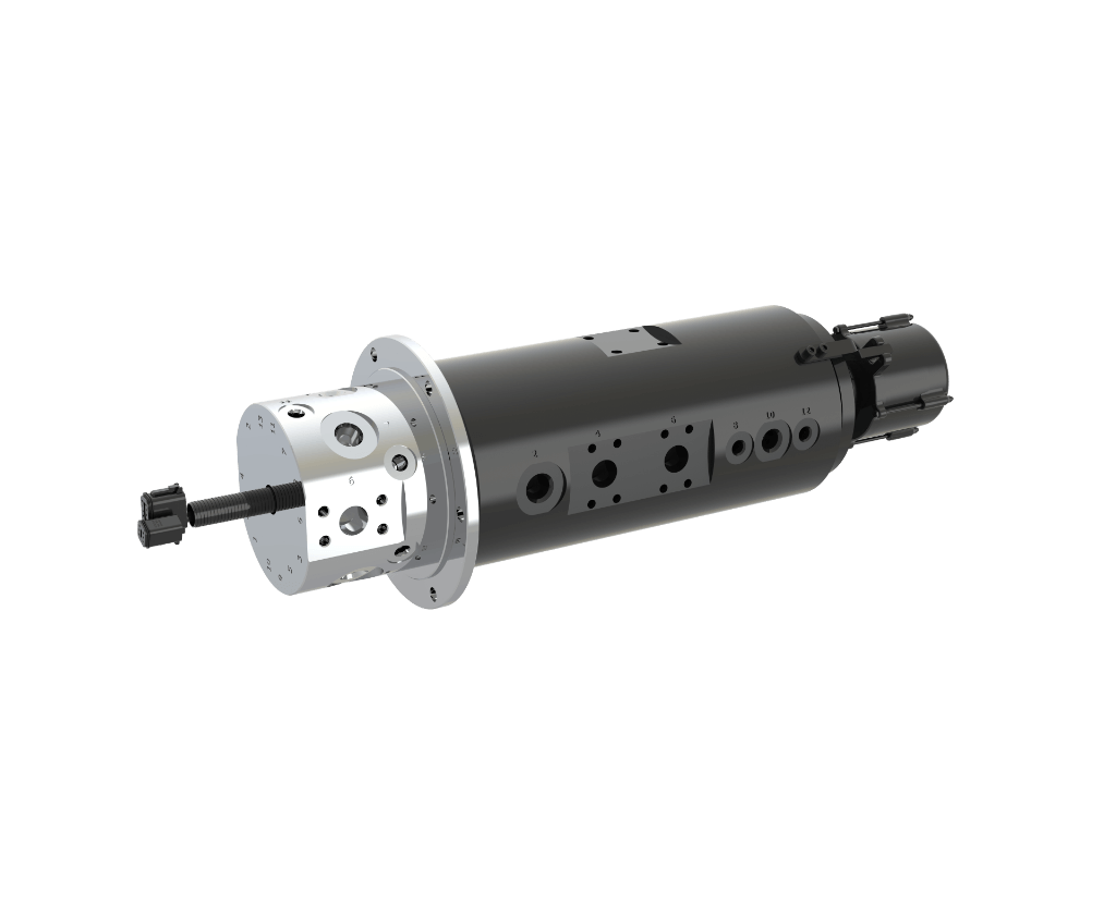 Complessi distributori rotanti fluidici per movimentatori telescopici rotanti, equipaggiati da collettori elettrici per il trasferimento di potenza e segnali CAN BUS.